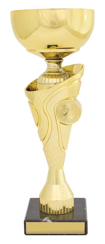 Effective series of cups with central, prominent position for a 50mm centre insert. Perfect to display your custom logo if available. Trophies in 3 sizes and feature metal bowl and marble base.