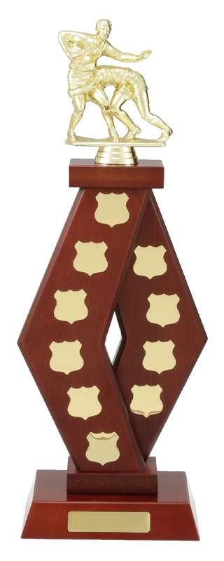 Substantial timber trophies are perfect for the perpetual awards at your school, club or organisation. Trophies are expertly finished in polished walnut timber. You must choose figure or top to complete your selection. Shields and plates sold separately.